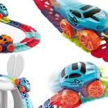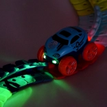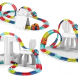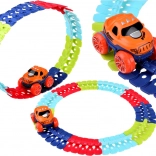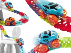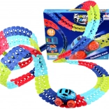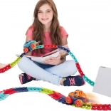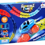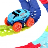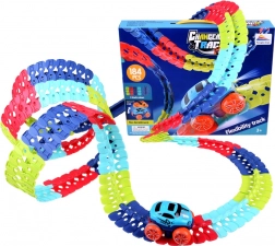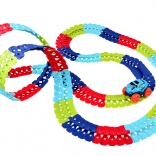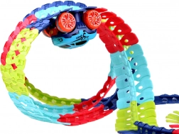 Deze kleurrijke racebaan van duurzaam plastic bestaat uit 184 koppelbare segmenten die je naar wens kunt buigen en herconfigureren. Creëer een dynamisch parcours vol bochten, lussen en hoogteverschillen – de geleiderail in het midden helpt het autootje veilig op de baan te houden. Na het plaatsen van 3× AAA (niet inbegrepen) rijdt het autootje vooruit met één druk op de knop en licht het rood en groen op tijdens het rijden.