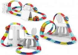 De koppelbare baan van 184 delen kan vrij worden gebogen en laat je lussen en dynamische bochten maken. In het midden bevindt zich een geleiderail voor stabiele ritten.