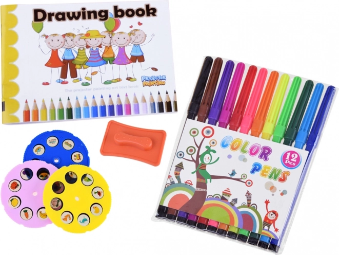 De verwisselbare dia’s bieden een verscheidenheid aan motieven van dieren, voertuigen, fruit en groente, zodat kinderen niet alleen hun fijne motoriek oefenen, maar ook vormen en kleuren leren herkennen. De set met 12 gekleurde stiften, een tekenblok en houders voor schrijftools houdt alles netjes binnen handbereik.