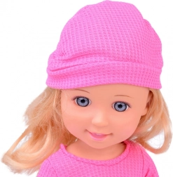 De roze blouse, paarse rok en roze muts geven de pop een elegante look, ideaal voor modieus rollenspel.