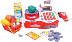 - Kassa met rekenmachine, scanner, weegschaal en microfoon; mandje; euromunten en -biljetten; betaalkaart; voedselimitaties (kip, maïs, paprika, water, ketchup, melk)