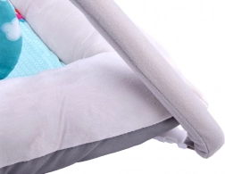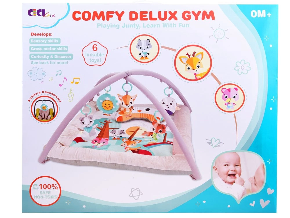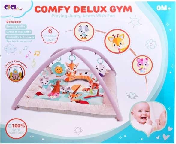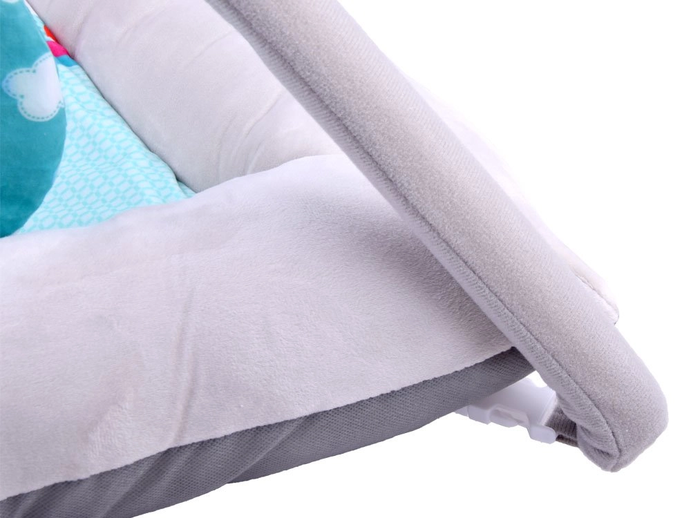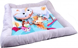 Zachte en comfortabele speelmat met babygym biedt een veilige en stimulerende plek om te spelen en te rusten. Bevat hangspeeltjes met sensorische effecten, een veilig spiegeltje, zachte verhoogde randen en een ondersteunend kussentje voor het comfort van de baby. Ondersteunt de ontwikkeling van fijne en grove motoriek, oog–handcoördinatie en zintuiglijke waarneming.
