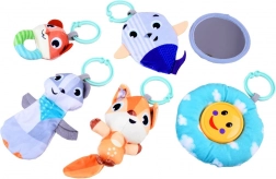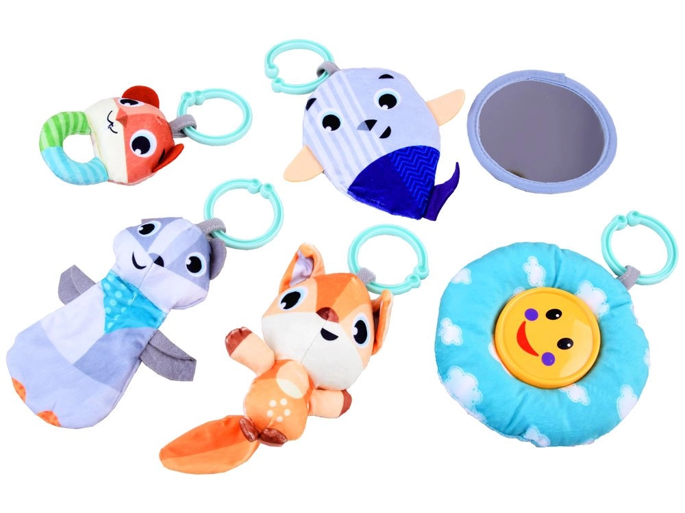 Set hangende diertjes met rammelaars, knisperende delen, een veilig spiegeltje en een zonnetje met melodie stimuleert het zicht, gehoor en de tastzin van je kindje.