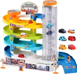 Meerlaagse parkeergarage voor kinderen met een elektrische en handmatige lift, spiraalafritten en 6 kleurrijke autootjes. Inclusief verkeersborden, bewakersfiguur en stickers voor realistisch speelplezier. Een geweldige keuze voor de creatieve en motorische vaardigheden van kinderen.