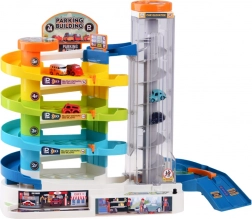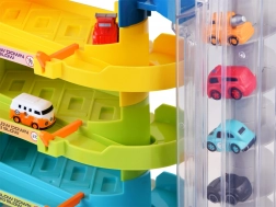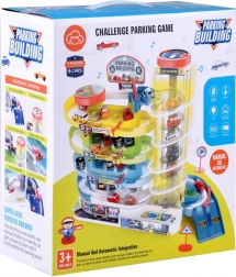 Deze kleurrijke plastic parkeergarage met vier verdiepingen biedt kinderen volop actie: autootjes racen over spiraalvormige hellingen en verplaatsen zich tussen verdiepingen met een transparante lift. De lift werkt handmatig of elektrisch met 3× AA-batterijen (niet inbegrepen). Tijdens elektrisch gebruik gaan lampjes branden en speelt vrolijke muziek.