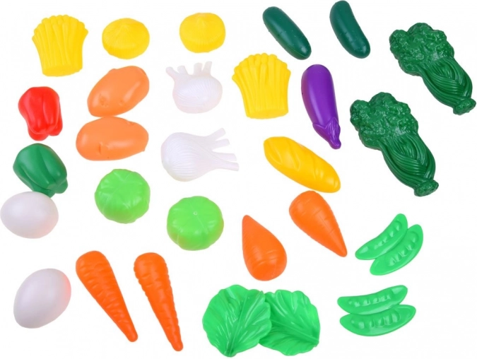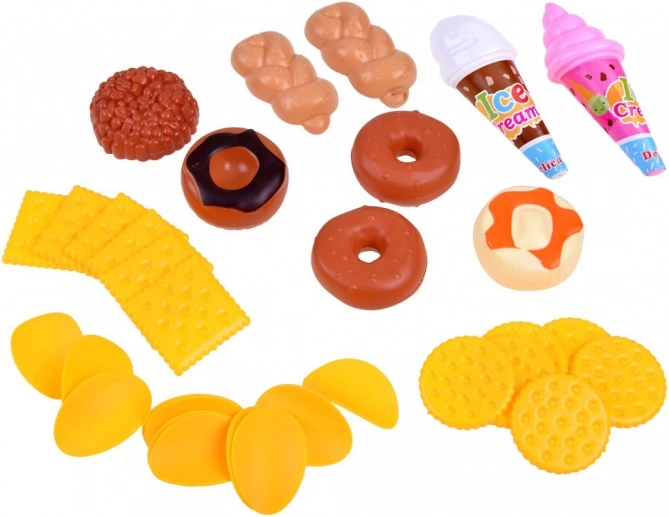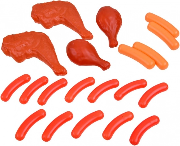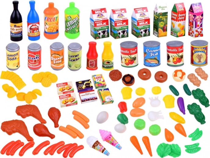 Natuurgetrouw vormgegeven stukken zoals kippenboutjes, worstjes, ijsjes, koekjes en pakjes sap stimuleren creativiteit en het nabootsen van volwassenen in de keuken en winkel.