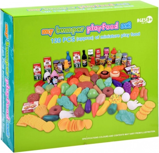 Een kleurrijke set speelgoedvoedsel met ca. 120 stuks verandert elke kinderk keuken of winkel in een plek vol fantasie. Je vindt er fruit, groenten, brood en gebak, vlees, zuivelproducten, dranken en zoetigheden. De lichte en stevige stukken zijn ideaal voor rollenspel en stimuleren creativiteit, communicatie en fijne motoriek. Het speelgoed is niet bedoeld voor consumptie.