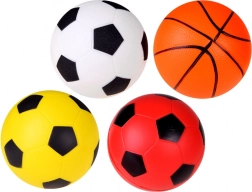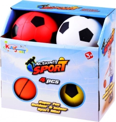 Drie ballen in voetbalstijl (wit, geel, rood) en één basketbal zorgen voor afwisseling in spel en training.