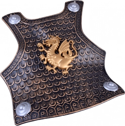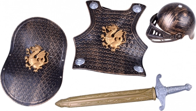 Word een dappere ridder met deze complete set voor verkleedpartijen en alledaagse spelletjes. De set bevat een harnas, een helm met beweegbaar vizier, een schild en een zwaard met schede. Licht en veilig plastic, gedetailleerde versieringen en een draakmotief in antiekgoud zorgen voor veel creatief speelplezier en fantasie.