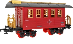 De set bevat een locomotief en 3 wagons, 22 raildelen, een station, wachtruimte, boompjes, oplaadbare accu en USB-kabel. Na montage krijg je een royale baan van 213 × 120 cm, ideaal voor lange ritten en creatief bouwen.