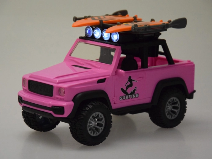 Dankzij de robuuste rubberen wielen met opvallend profiel overwint de wagen elke “terrein”-hindernis in het spel. De dakdrager met twee surfplanken benadrukt het strand- en reisthema, waardoor de auto perfect past in elke kinderlijke fantasiewereld.