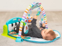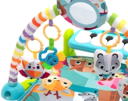 De interactieve piano met lichteffecten en melodieën motiveert kinderen om met voetjes en handjes te bewegen. Hangspeeltjes, rammelaars en een babysafe spiegeltje ontwikkelen zicht, gehoor en tast en ondersteunen de oog-handcoördinatie. De mat is zacht, aangenaam aan te raken en gemakkelijk te onderhouden.