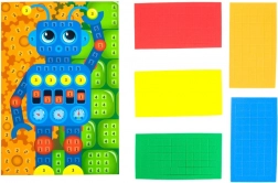 Deze eenvoudige en kleurrijke set maakt alle kleine makers blij. Zelfklevende foamstukjes worden volgens het voorbeeld of de eigen fantasie op een kartonnen ondergrond geplakt, zodat het kind spelenderwijs een mooie afbeelding maakt zonder rommel en zonder lijm of schaar nodig te hebben.