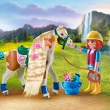 Ellie houdt ervan om de manen en staart van haar geliefde Pinto-paard te versieren met prachtige accessoires. Voordat ze op pad gaat met de Paint Horse-ruin, wacht er een speciale ervaring: haarstyling met een crimptang, die ook deel uitmaakt van de set. Dankzij de golvende manen is Pinto de nieuwe ster van de Waterfall Ranch!