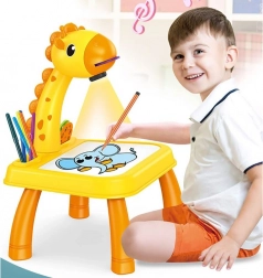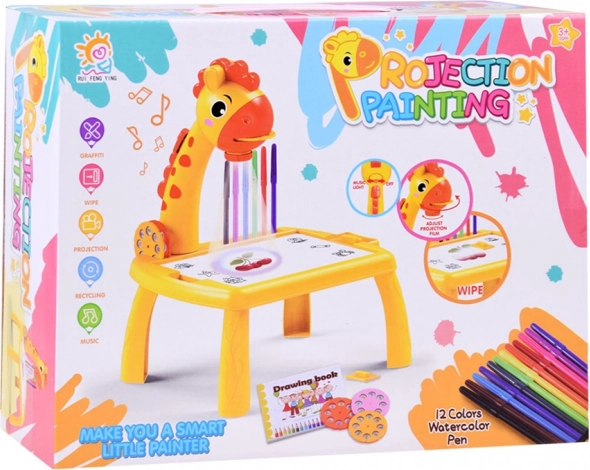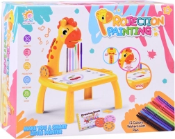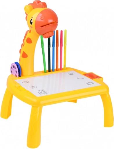 Een schattige tekenprojector in de vorm van een giraffe projecteert voorbeelden op papier, tafel of muur en helpt kinderen eenvoudig over te trekken en te kleuren. Inclusief een tekentafeltje, 12 stiften, 3 sets dia’s (dieren, fruit en groente, voertuigen) en praktische houders voor accessoires – ideaal voor de ontwikkeling van creativiteit en fijne motoriek.