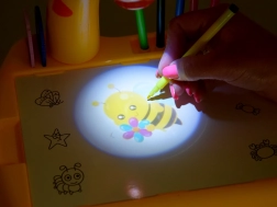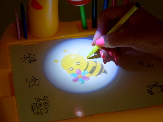 De projector projecteert heldere voorbeelden van schijven direct op het tekenoppervlak, zodat kinderen eenvoudig kunnen overtrekken en stap voor stap leren tekenen.