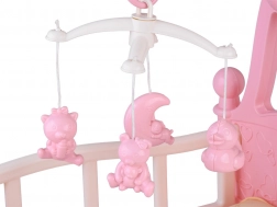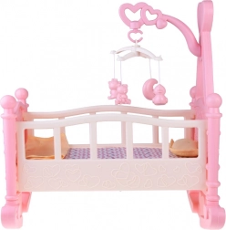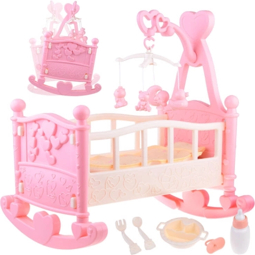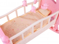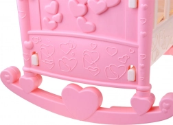Deze plastic wieg is ideaal voor poppen of knuffels tot 42 cm. Versierd met hartjes en een kleine mobiel, biedt het kinderen plezier in de zorg voor hun speelgoed en stimuleert het hun creativiteit en verbeelding.