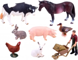 Deze set biedt kinderen een authentieke boerderij-ervaring. De realistisch vormgegeven figuren zoals een koe, paard, biggetje, haas, eend, kip en konijn worden aangevuld met een boer met kruiwagen. De met de hand beschilderde details en de prettige afmetingen zorgen voor comfortabele grip en langdurig speelplezier.