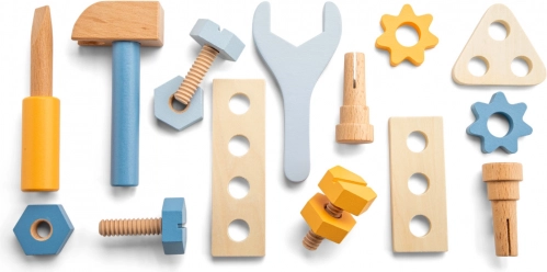 De set bevat 16 functionele onderdelen: een hamer, schroevendraaier, sleutel, spijkers, schroeven en tandwielen voor eindeloze speelmogelijkheden. Vervaardigd uit FSC-gecertificeerd hout, een duurzame keuze voor ouders én de planeet.