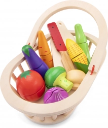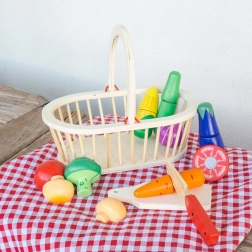 De mand, snijplank en het mes, samen met een ruime selectie groente, maken opbergen en dragen eenvoudig en stimuleren realistisch spel in de kinderkeuken.