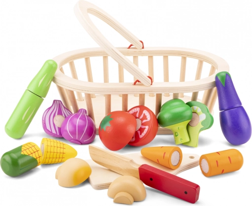 De set bevat een mand voor eenvoudig opbergen en dragen, een snijplank en een houten mes. De kleurrijke groentestukken – tomaat, wortel, broccoli, aubergine, ui, maïs, champignons en komkommer – nodigen uit tot ontdekken en leren over gezond eten.