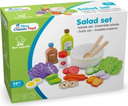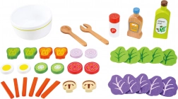 Deze realistische houten salade-set biedt kinderen een leuke manier om het bereiden van een favoriet gerecht uit te proberen. In de doos vinden ze een saladeschaal, serveerbestek, een pepermolen, flesjes voor dressing en olijfolie en een kleurrijke mix aan ingrediënten: slablaadjes, wortelstaafjes, plakjes champignons, eitjes, komkommer, tomaat, rode ui en paprika.