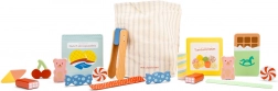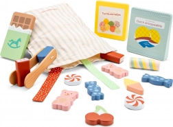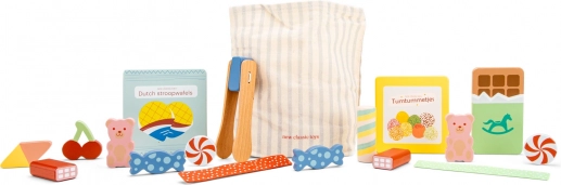 Schattige houten snoepjesset voor kinderen vanaf 3 jaar, veilig en creatief speelplezier. Bevat 16 lekkernijen, tangetjes en een stoffen tas. Stimuleert fijne motoriek, fantasie en sociale vaardigheden. Gemaakt van 100% FSC-gecertificeerd hout voor duurzaamheid en milieuvriendelijkheid.