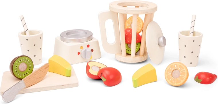 De set bevat vijf soorten fruit (banaan, aardbei, appel, sinaasappel en kiwi), elk verdeeld in twee helften die je met het houten mes op de snijplank kunt “snijden”. Twee bekers met rietjes zijn perfect om de “smoothies” te serveren. De hoge kwaliteit van het hout en de aangename kleuren zorgen voor veilig en langdurig speelplezier voor kinderen vanaf 3 jaar.