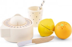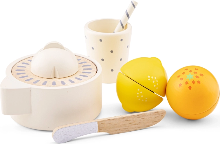 - Inhoud set: citruspers, sinaasappel en citroen met klittenband, houten mes, bekertje met rietje