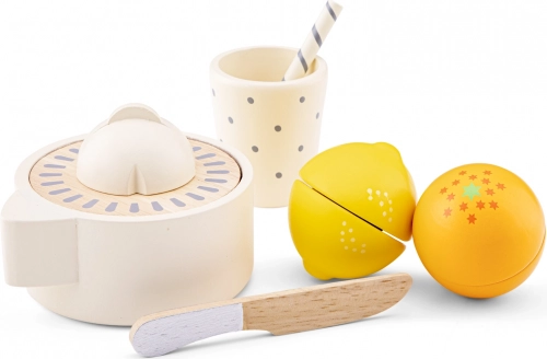 • Inhoud set: citruspers, sinaasappel en citroen met klittenband, houten mes, bekertje met rietje