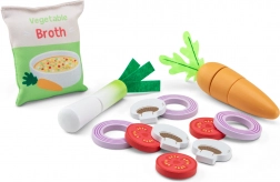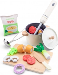 De set bevat een ruime variatie aan ingrediënten: wortel, prei, rode ui, plakjes tomaat en paddenstoelen en een stoffen zakje met “groentebouillon”. Kinderen kunnen hun eigen recepten uitproberen, de soep met de soeplepel opscheppen en serveren als echte chef-koks.
