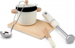 Deze kwalitatieve kinderset biedt jonge koks een realistische kookervaring – van het snijden van ingrediënten tot het mixen van soep direct in de pan. Alle onderdelen zijn ontworpen voor kleine kinderhanden en veilig spel, met een combinatie van FSC-gecertificeerd hout, metaal en textiel voor duurzaamheid en een authentieke uitstraling.