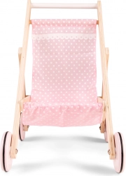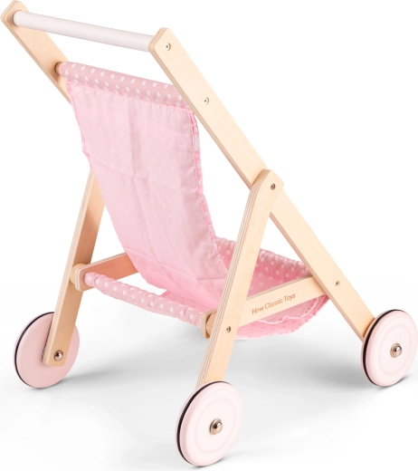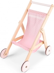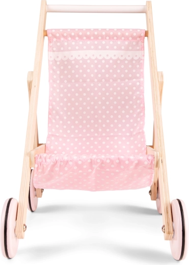 Deze stijlvolle houten poppenwagen combineert de duurzaamheid van een natuurlijk materiaal met subtiele roze textiele details. Hij is stabiel, gemakkelijk te besturen en dankzij de rubberen ringen op de wieltjes zeer stil – ideaal voor in huis en de kinderkamer. De hoogte van het duwhandvat van 50 cm zorgt voor comfortabel duwen voor kleuters.