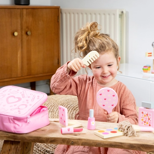 Deze houten make-up set is ontworpen om fantasierijk spel te bevorderen en de creativiteit van kinderen te ontwikkelen. Alle onderdelen, realistisch ogende cosmetische accessoires, zijn zorgvuldig opgeborgen in een roze koffertje met handvat, wat eenvoudig transport mogelijk maakt.
