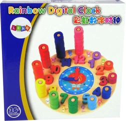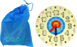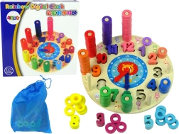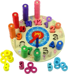 De houten educatieve klok is een ideaal hulpmiddel voor de eerste kennismaking met cijfers en tijd. Elk cijfer heeft zijn eigen kleurcode en het kind koppelt er het juiste aantal ringetjes aan op de pinnetjes – een leuke manier om op natuurlijke wijze tellen en visueel sorteren onder de knie te krijgen. De draaibare wijzers maken het mogelijk om nauwkeurig uren en minuten te lezen.