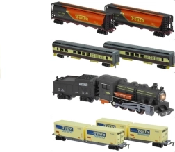 - Inhoud van de doos: locomotief, 6 wagons, ca. 10 m rails, 4 boompjes