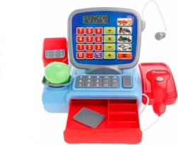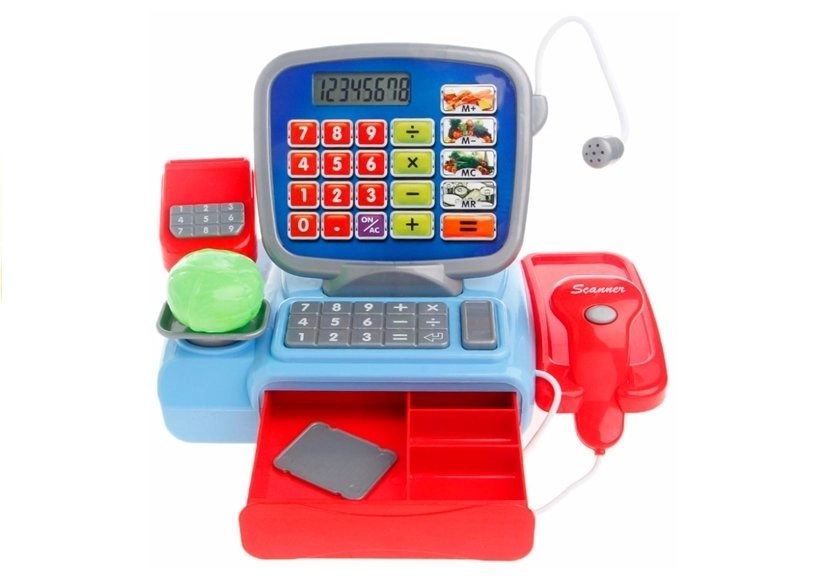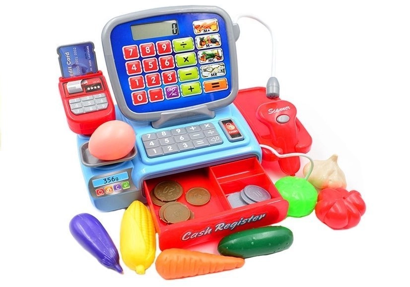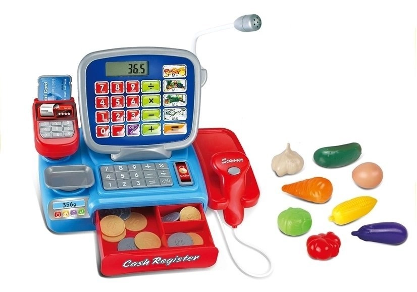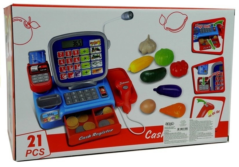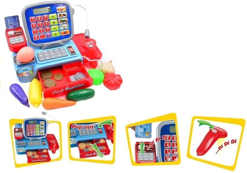 Een functionele kassa is ideaal om rekenen, verkopen en kopen te leren. De elektronische kassa heeft een werkende scanner die bij het indrukken geluiden maakt en oplicht. De kassa dient ook als rekenmachine: je kunt productprijzen optellen en tegelijk leren rekenen. De kassa heeft een imitatie-microfoon en een uitschuifbare muntenlade. Naast de kassa staat een weegschaal waarop de meegeleverde etenswaren kunnen worden gewogen. Het kind kan een betaalkaart accepteren en met munten betalen.