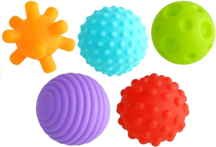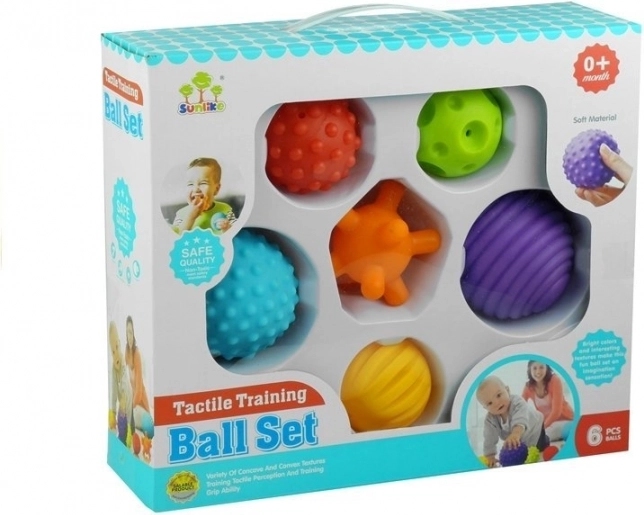 Deze kleurrijke set van zes sensorische ballen is ideaal voor de eerste ontdekking van de wereld van aanrakingen. Elke bal heeft een andere textuur – groeven, bobbels of kuiltjes – die de handpalmen en vingers zachtjes masseren en zo de fijne motoriek en oog-handcoördinatie bevorderen. De verschillende kleuren en diameters motiveren kinderen tot actief spel, sorteren en ontdekken.