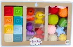 Zachte educatieve badblokjes vormen een innovatieve set met 20 kleurrijke rubberen onderdelen. Elk van de acht blokjes is uniek in zijn eigenschappen, die helpen de cognitieve vaardigheden van kinderen te ontwikkelen. Met verschillende vormen en reliëfs kunnen de blokjes worden gecombineerd tot een breed scala aan constructies, wat op een speelse manier de fijne motoriek en hand-oogcoördinatie traint.