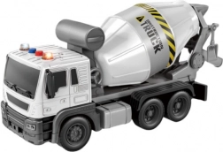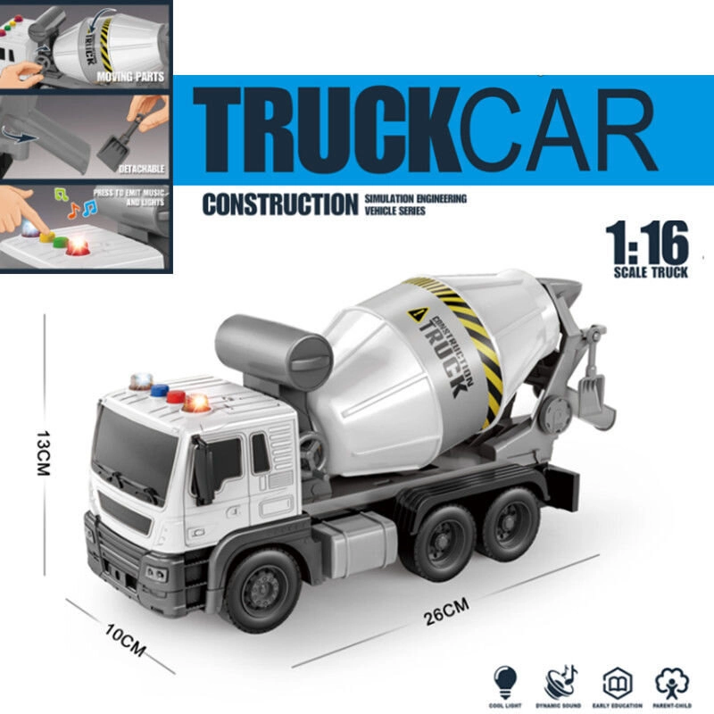 Aan de achterzijde van het voertuig bevindt zich een witte, beweegbare, roterende trommel met een draaibare goot. Hij kan in beweging worden gezet met de knop aan de voorste zijkant. De goot is beweegbaar en kan naar rechts of links worden gericht. Achterop hangt een klein grijs schepje, zodat je gemakkelijk aan het werk kunt op de speelgoedbouwplaats. Het speelgoed is zeer realistisch vormgegeven, met stickers die kenmerkend zijn voor dit type voertuig en diverse nagebootste belangrijke details. Het voertuig is uitgevoerd in schaal 1:16.