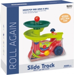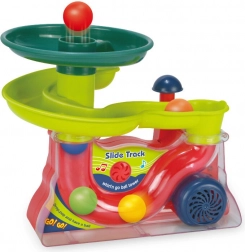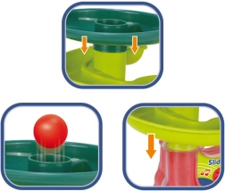 Deze kleurrijke fontein met balletjes betovert elk kind met de combinatie van beweging, licht en geluid. De grote knop bovenop zet het mechanisme in werking dat de balletjes omhoog lanceert. Daarna rollen ze sierlijk via de spiraalvormige glijbaan terug naar het midden en begint alles opnieuw – een spel dat niet snel verveelt.