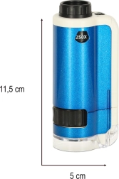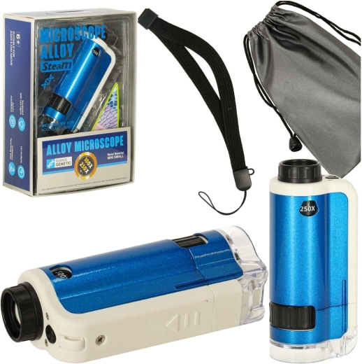 Ontdek de fascinerende microscopische wereld met de zakmicroscoop voor kinderen. Dit apparaat maakt gedetailleerde verkenning mogelijk van verschillende objecten zoals bladeren, textielvezels of zoutkristallen, dankzij dubbele vergroting (100x, 250x). De microscoop is uitgerust met een LED-licht, dat zorgt voor optimale verlichting.