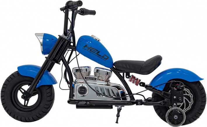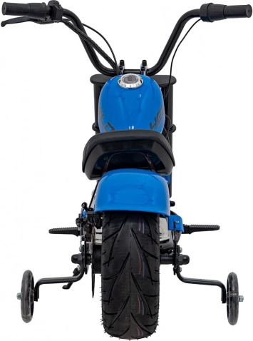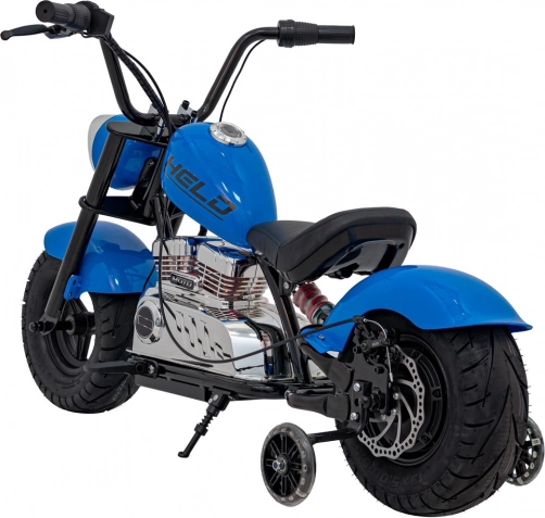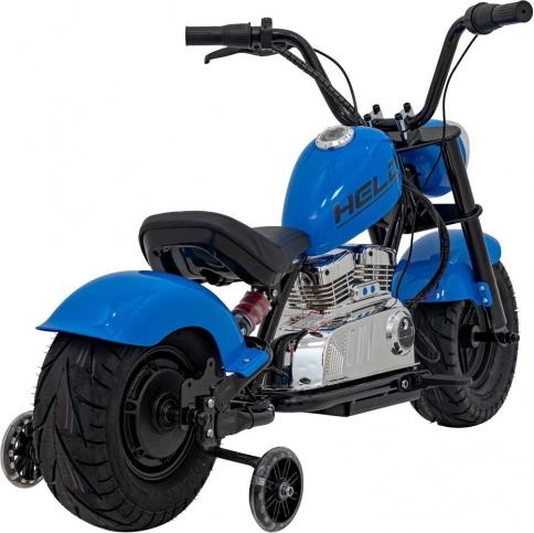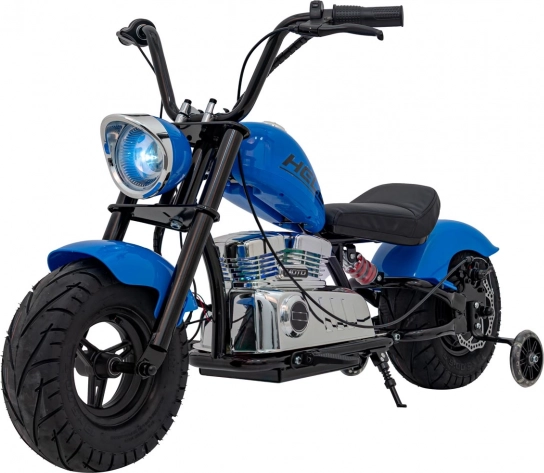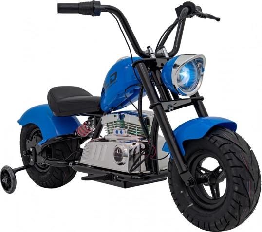 Stijlvolle elektrische kindermotor in chopper-stijl met een krachtige borstelloze motor van 350 W, een 36V-accu, opblaasbare wielen en zijstabilisatiewieltjes voor veilige eerste ritten. Inclusief LED-licht, motorgeluiden en een audiopaneel met MP3/USB voor extra plezier.