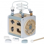 De houten educatieve kubus biedt veel attracties die uw kind zeker zullen boeien en verrukken. Elk element is zorgvuldig ontworpen om perfect in de handjes van uw kleine ontdekkingsreiziger te passen. De stevige houten constructie garandeert duurzaamheid en de zachte pastelgrafiek prikkelt de verbeelding en bevordert de concentratie. Beweegbare elementen die kunnen worden geschoven, ingedrukt en gemanipuleerd, ondersteunen de ontwikkeling van fijne motoriek en zorgen tegelijkertijd voor leuk en leerzaam spel.
