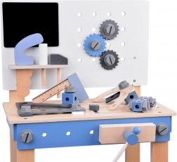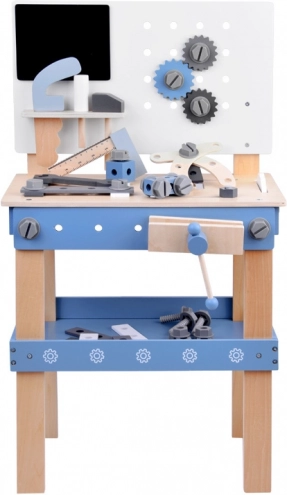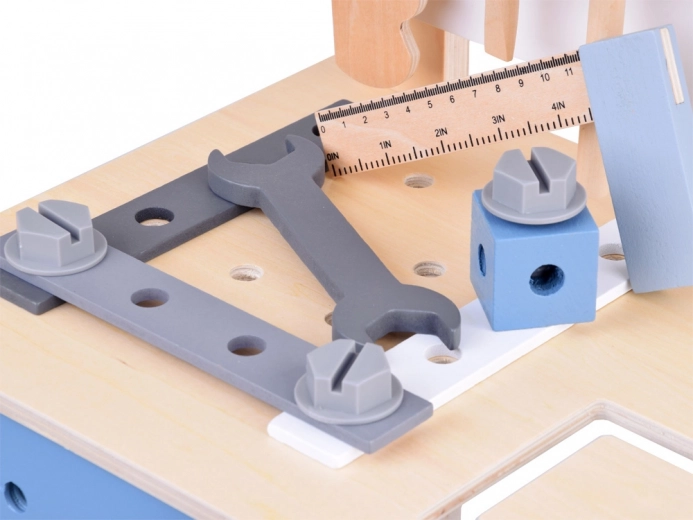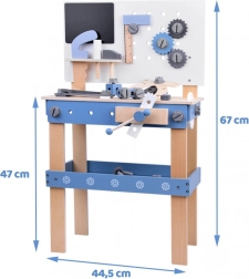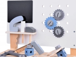 Veiligheid staat voorop: alle onderdelen zijn glad geschuurd, met afgeronde randen en niet-giftige verven. De geïntegreerde schaalverdeling op het tafelblad leert kinderen werkorganisatie en de basis van meten, terwijl het geperforeerde paneel en de draaibare tandwielen uitnodigen tot fantasierijk spel.