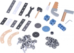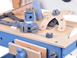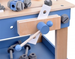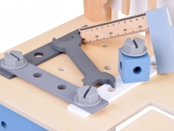 Deze houten kinderwerkbank is ontworpen om handigheid, coördinatie en logisch denken te ontwikkelen. De gevarieerde set accessoires – van schroeven, moeren en verbindingslatten tot tandwielen, liniaal, bankschroef, hamertje en schroevendraaier – stelt kinderen in staat om te schroeven, te meten, te bevestigen en met overbrengingen te experimenteren.