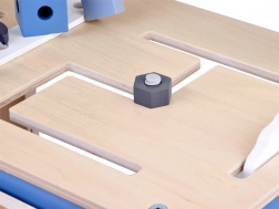Een functionele bankschroef, geperforeerd paneel en draaibare tandwielen bieden een authentieke ervaring en motiveren kinderen om te bouwen en bewegingsprincipes te ontdekken.