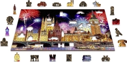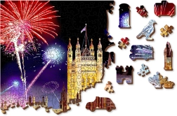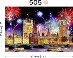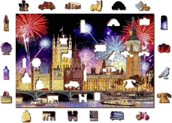 De dubbelzijdige 2-in-1 uitvoering biedt twee uitdagingen in één: aan de voorkant leg je het kleurrijke motief van Londen met vuurwerk, aan de achterkant een herhalend patroon voor vormenpuzzelen. Ondanks het kleinere aantal stukjes is het dankzij de uiteenlopende vormen uitdagender en leuker. De puzzel is gemaakt van stevige HDF-plaat (3–4 mm) en wordt geleverd in een eco-verpakking zonder plastic met een meegeleverde voorbeeldposter.