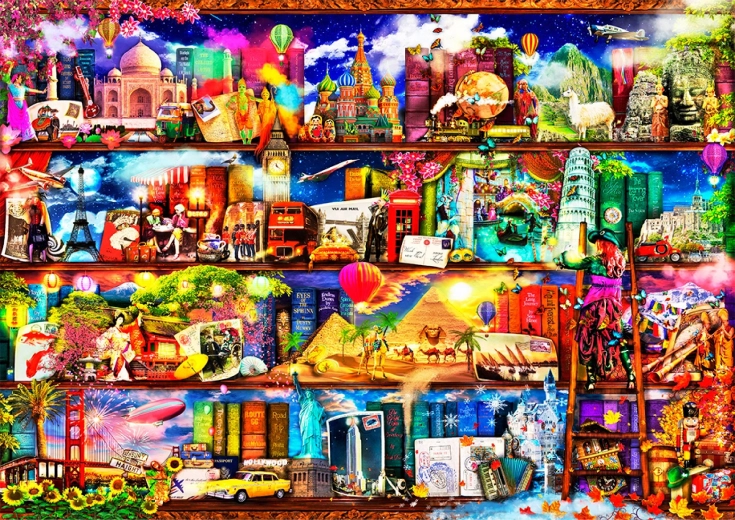 Houten dubbelzijdige puzzel WOODEN CITY – boekenplank over reizen, 505 stukjes