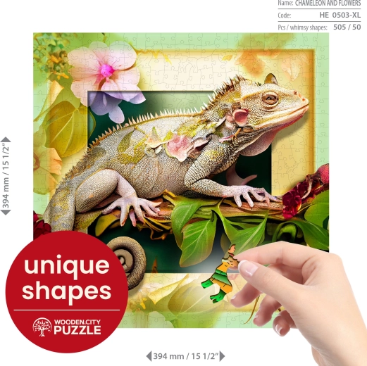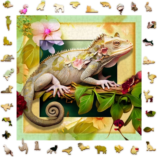 Trakteer jezelf op een premium puzzelervaring. Deze houten puzzel van HDF-plaat met een dikte van 3–4 mm heeft laser-gesneden stukjes met gladde, splintervrije randen en details die het motief van de kameleon en bloemen prachtig accentueren. Een deel van de stukjes heeft de vorm van dieren, gebouwen of voorwerpen, zodat ze ook als kleine, losse figuurtjes kunnen staan.